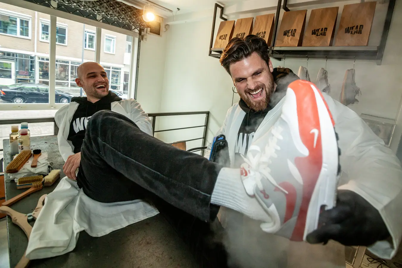 That something became WEAR: a sneaker cleaning concept born in 2020 out of equal parts love for footwear and frustration. After trying (unsuccessfully) to get their own sneakers cleaned at a top sneaker store in Rotterdam, Lorenzo and Pim saw an opening. "One plus one is two," he recalls.