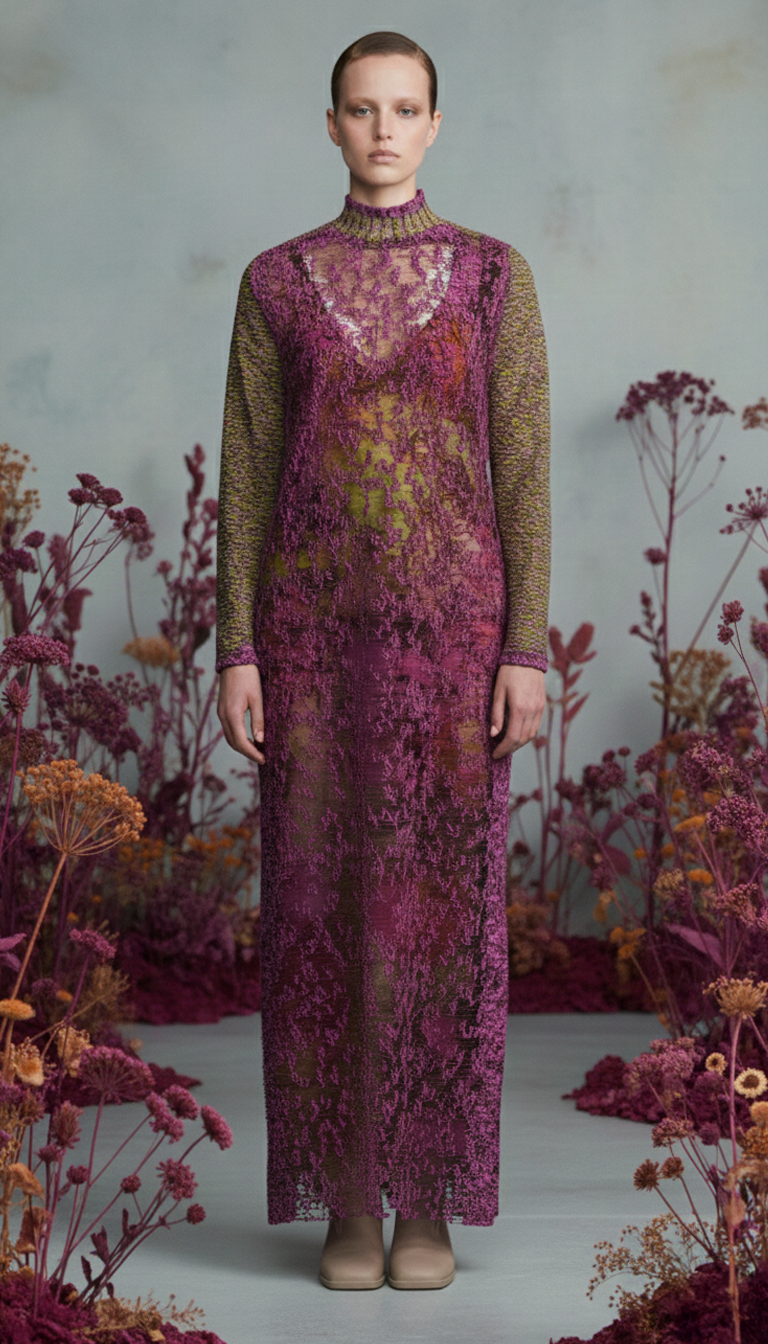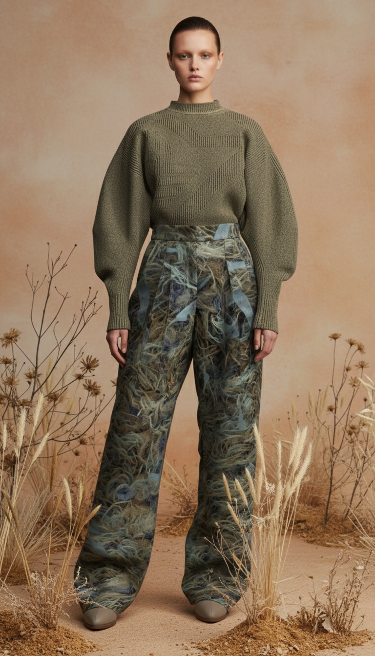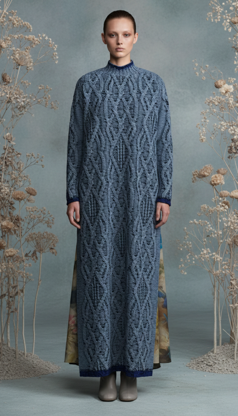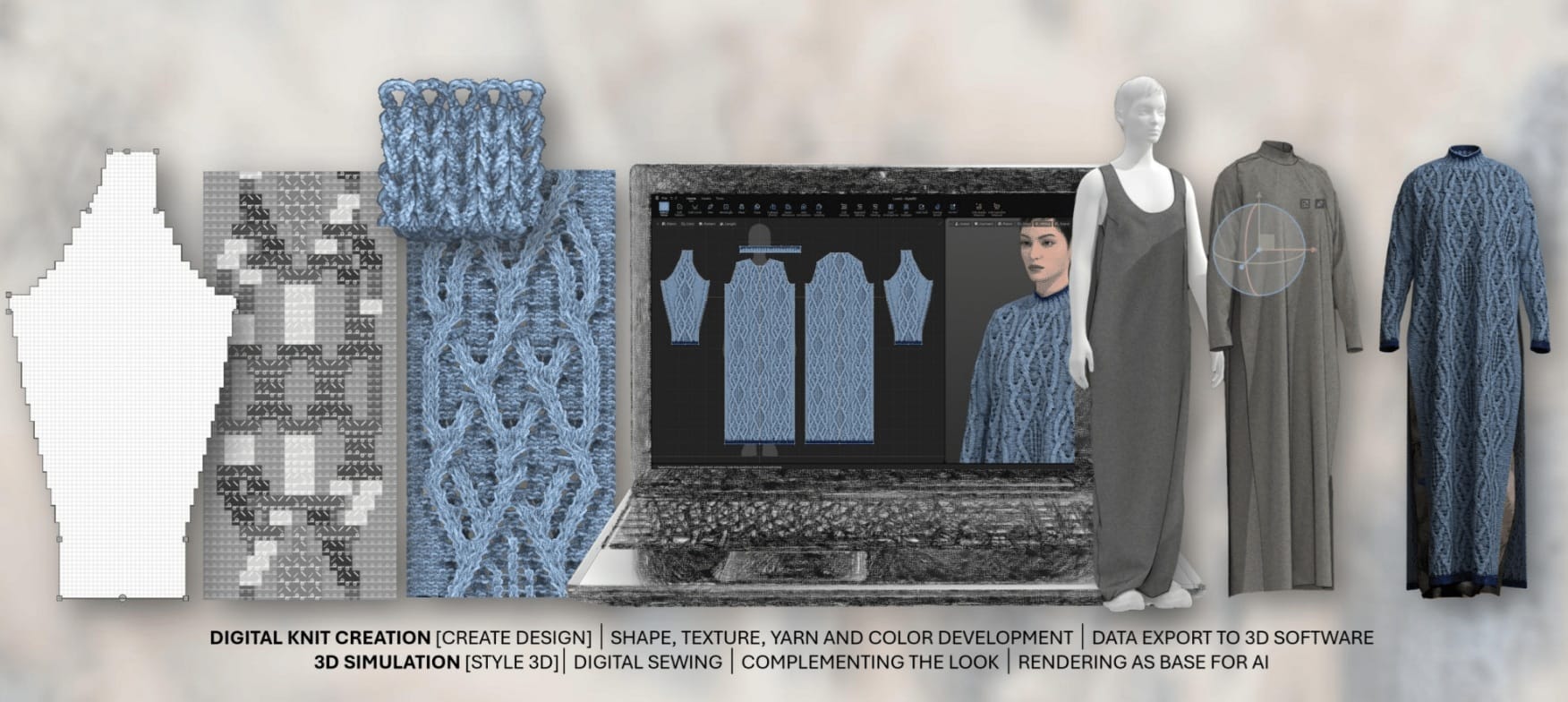 Her process begins deliberately and without AI. Knit structures, yarn logic, garment construction, and 3D visualisation are developed first using specialist knitwear and 3D tools. Only once the garments are resolved does AI enter the picture, not to design the product, but to explore how it is presented.