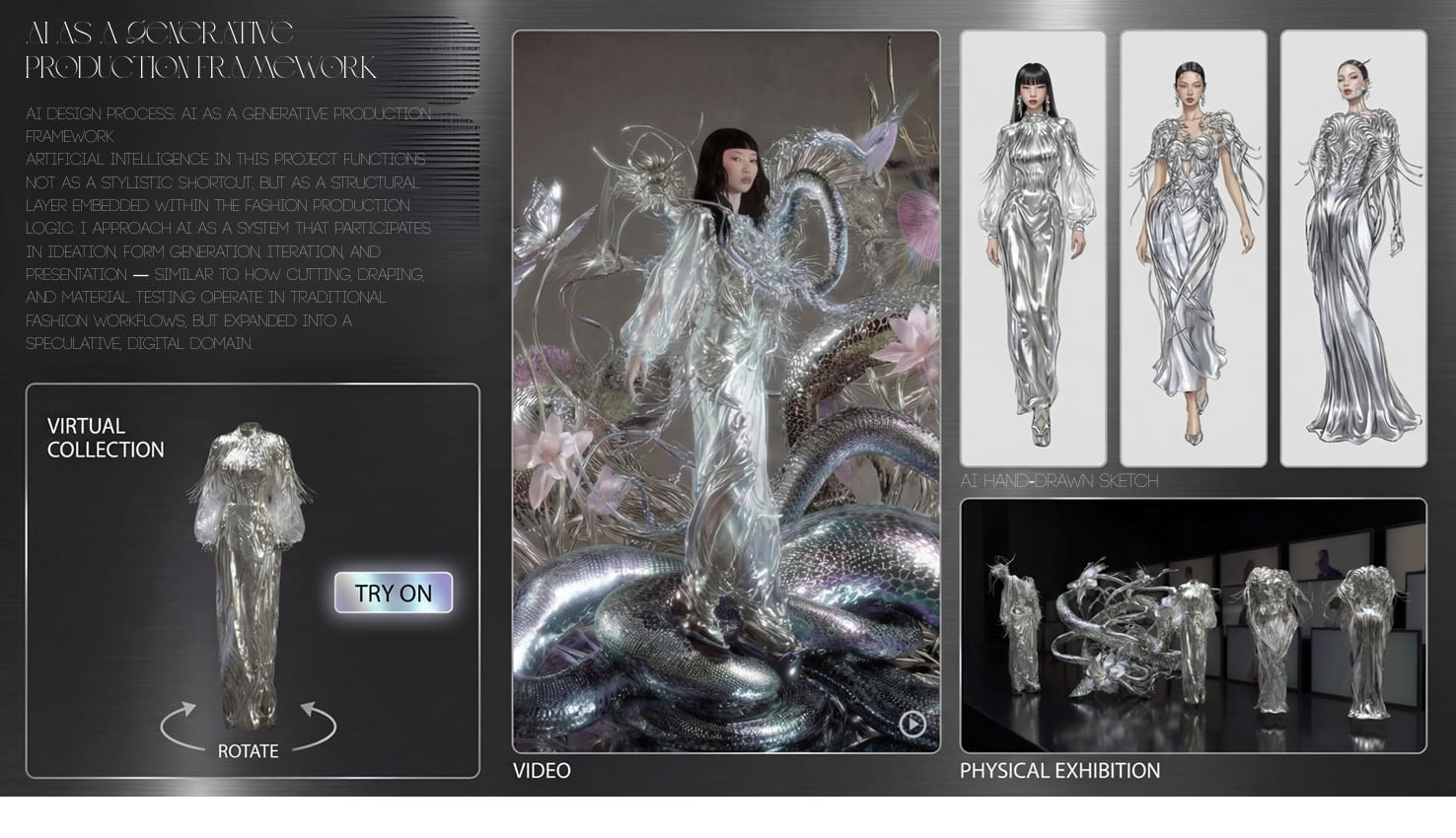 Only once those foundations are clear does she invite AI into the dialogue. Rather than aiming for finished outputs, she uses AI to explore unexpected silhouettes, structural tensions, and possibilities she might not have imagined alone.