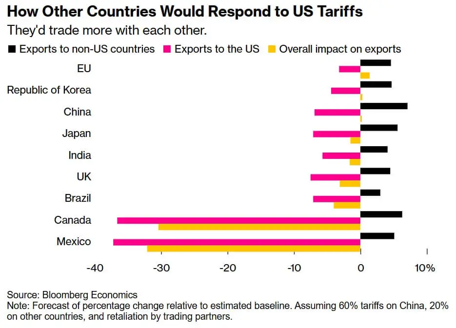 The Bloomberg Economics forecast of trade impacts from proposed US tariffs presents a stark picture of potential disruption, particularly for North American trade partners.