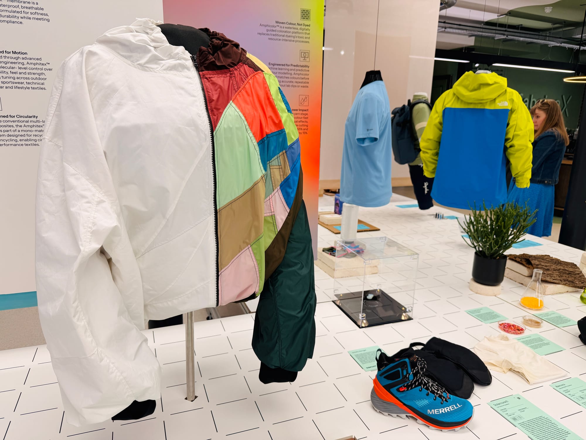 The exhibition's Reimagining Materials section explores a wave of innovators working to redesign the building blocks of performance textiles and footwear. Rather than simply improving existing synthetics, many of these projects attempt to rethink what materials are made from, how they are produced, and how they return to the environment.